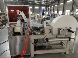 Принцип работы оборудования: Подача сырья с помощью пневмоцилиндра → Транспортировка → Автоматическая коррекция положения материала → Сгибание "малым треугольником" → Прикатывание и запайка кромки → Штамповка (вырубка) → Вывод готовой продукции → Автоматическая смотка обрезков → Автоматический подсчет и укладка в стопу → Транспортировка к фасовочно-упаковочному автомату (5-30 шт./пакет) → Вывод упакованной продукции.