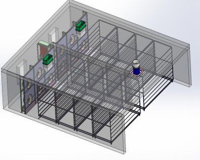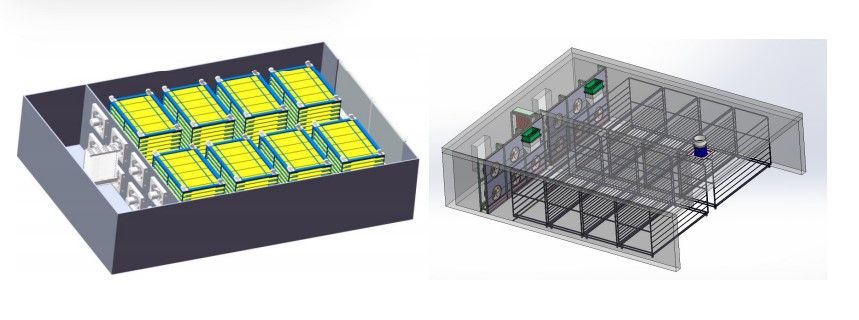 Размер одной стойки: 2300 * 1420 * 2150 мм. Одна стойка вмещает 12 ярусов. Производительность одной сушильной камеры составляет около 830 м².