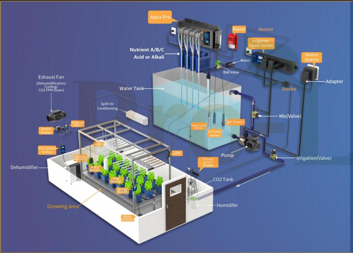 | Система смешивания удобрений и контроля | 1. BeHive-E: Система экологического контроля. Контролирует и регулирует ключевые параметры окружающей среды, такие как температура, влажность и освещенность в теплице или на растениеводческом предприятии. 2. BeHive-I: Система управления орошением. Управляет автоматическим орошением и фертигацией, запуская полив на основе расписания или данных датчиков. 3. BLS-4: Датчик окружающей среды 4 в 1. Одновременно измеряет температуру, влажность, интенсивность освещения и влажность почвы. 4. BTS-AR: Контроллер кондиционера. Устройство регулирует работу систем кондиционирования воздуха (режимы охлаждения, обогрева, вентилятора) для поддержания стабильной температуры окружающей среды. 5. BCB-12: 12-канальный релейный контроллер. Подключается к электрическим устройствам (например, лампам, насосам, вентиляторам) и переключает их для многоканального автоматического управления включением/ выключением. 6. CO2: Электромагнитный клапан для диоксида углерода. Контролирует выброс CO2 из системы подачи в окружающую среду, чтобы оптимизировать концентрацию для фотосинтеза растений. | |