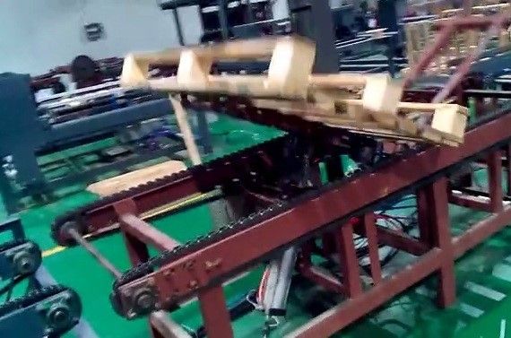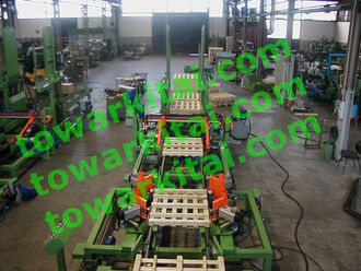 Линия по производству поддонов включает ручную загрузку (подачу) материала, автоматическую систему забивки гвоздей, подъемное устройство поддонов, автоматический станок для поддонов в стопки, маркировочную машину и станок для обрезки углов.